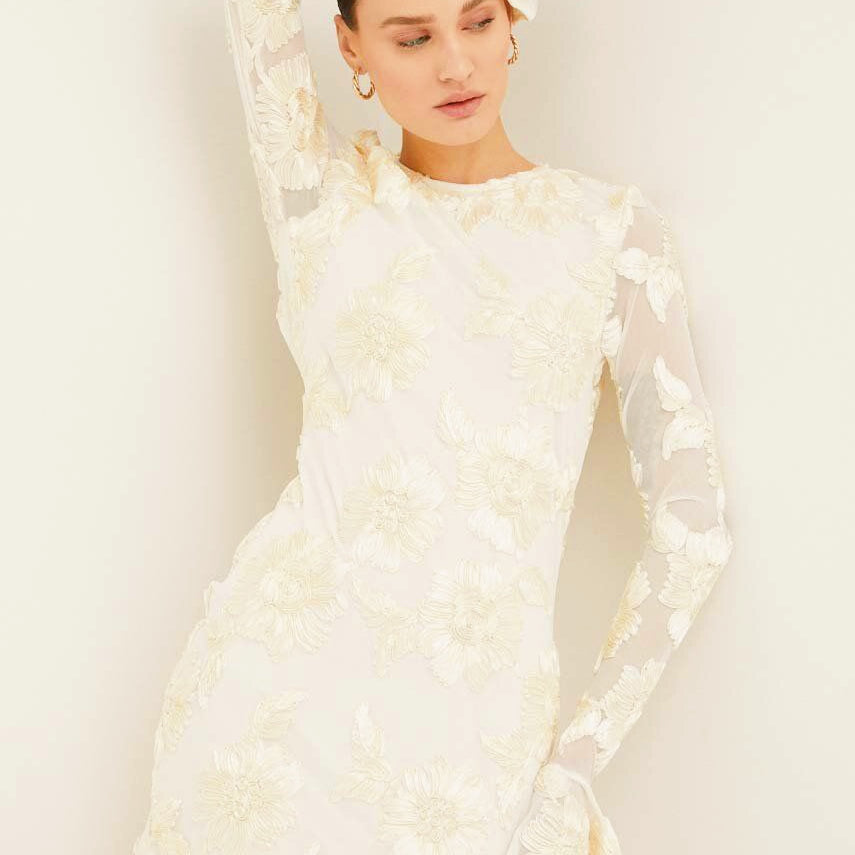 Bu mini elbise zarif işlemeli şerit çiçeklere ve şık sırtı açık bir tasarıma sahiptir. Geniş kollar dramatik bir dokunuş katarken, vücuda oturan örgü kumaş konfor için yüksek esnekliğe sahip göz alıcı bir silüet sağlar.