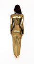 Altın (Stokta Mevcut), Mavi, Siyah ve Yeşil (tümü 2 haftalık teslimat süresine sahiptir) renklerinde mevcut olan bu elbise, göz kamaştırıcı metalik kaplamayı hoş bir kesim ve yüksek esneklikle birleştiriyor.