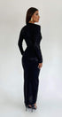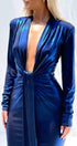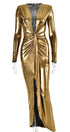 Bu son derece parlak metalik elbise, çarpıcı derin V yakalı, yüksek yırtmaçlı ve şık düğümlü bel hattına sahiptir. Metalik jarseden üretilen bu ürün, daha fazla konfor için yüksek esnekliğe sahip, vücuda oturan bir siluet sunuyor. Akşam etkinlikleri, kokteyl partileri veya özel günler için mükemmel olan bu elbise, göz alıcı bir görünüm için yüksek topuklu ayakkabılar ve cesur aksesuarlarla eşleştirilebilir.
