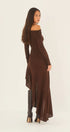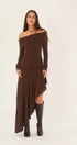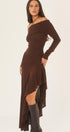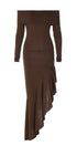 Bu omuzları düşük midi elbise, çarpıcı bir asimetrik etek ucuna ve vücuda oturan bir siluet için yüksek esnekliğe sahip örme jarseden yapılmış geniş bir eteğe sahiptir.