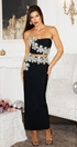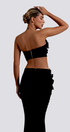 - Tasarım: Bedene oturan bodycon etekle eşleştirilmiş, yapay elmas çiçek süslemeli askısız kısa üst