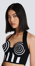 - Tasarım: Yüksek belli bodycon mini etekle eşleştirilmiş, siyah çizgili boyundan bağlamalı, omuzları açık kısa üst