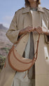 Yuvarlak şekli, köpük dolgusu ve el dikişi ile Avelin Omuz Çantası,eyer yapımının binicilik kodlarına gönderme yapıyor. Kanvas edisyonu, iki renk ipliğin birleştirildiği benekli yünden kesilmiş ve deri süslemelerle tamamlanmıştır.