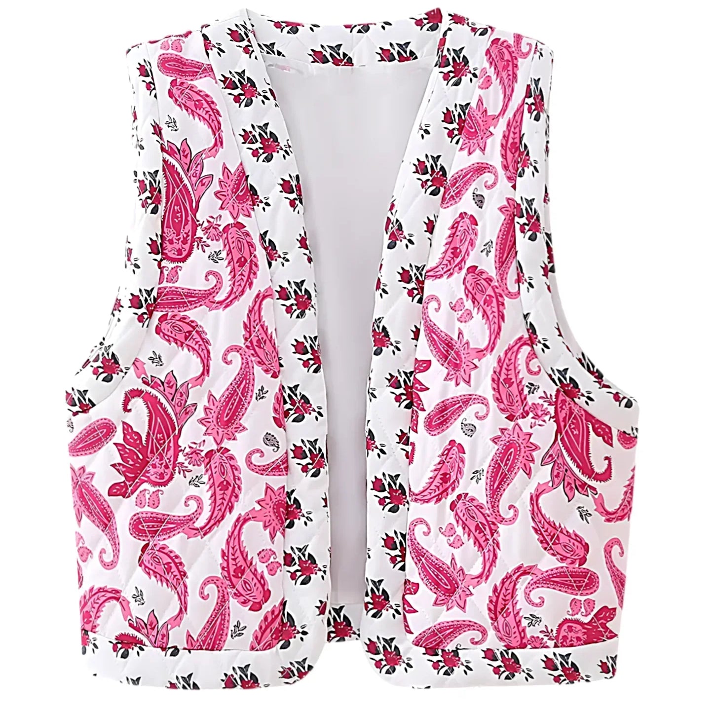 Bu baskılı kapitone yelek ile dış giyim koleksiyonunuzu zenginleştirin. V yakalı ve polyester ile hafif pamuk karışımına sahip bu yelek, şık tasarımı pratik sıcaklıkla birleştiriyor. Kapitone deseni ve benzersiz baskıları, klasik yelek stiline modern bir dokunuş katıyor.