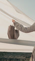 Bu dalgalı, katlı ve kıvrımlı tasarıma sahip heykelsi kompakt tote çanta iki şekilde kullanılabilir. Sepet tarzı, yanları açık ve kayışlar dışarıda, ya da yanları içe katlanmış ve kayışları içte çaprazlanmış çiçek benzeri kapalı çanta olarak.