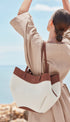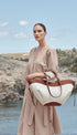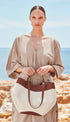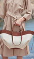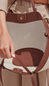Bu dalgalı, katlanmış ve kıvrımlı tasarıma sahip heykelsi tote çanta, iki şekilde kullanılabilir. Sepet tarzında, kenarları açık ve askıları dışarıda, ya da çiçek şeklinde kapalı çanta olarak, kenarları içe kıvrık ve askıları içte çapraz.