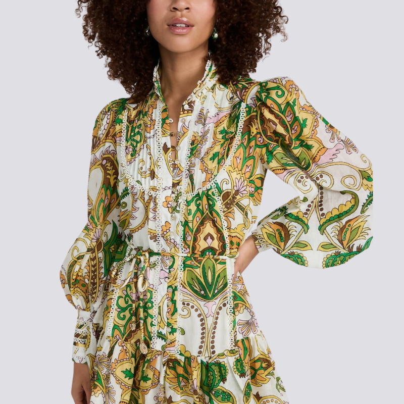 Bu benzersiz baskılı yüksek yakalı gömlek elbise, rahat kesimi şık ayrıntılarla birleştiriyor. Tek sıra düğmeler sofistike bir dokunuş katarken, kravatlı bel siluetinizi güzelleştirerek hoş bir görünüm sağlar.