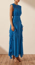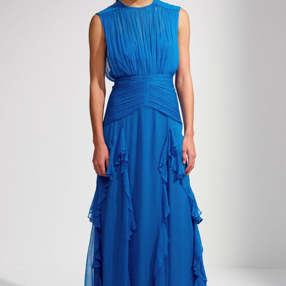 Eileen Pileli Yuvarlak Yaka Volanlı Uzun Elbise
