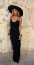 Derin V yakalı ve basamaklı fırfırlı şeritlere sahip bu çarpıcı uzun elbiseyle cesur bir giriş yapın. Sırtı açık tasarım ve yan yırtmaç, çekici bir dokunuş katıyor; resmi etkinlikler veya şık akşamlar için mükemmel. Orta derecede esnek şifondan üretilen bu elbise hem rahatlık hem de güzel bir uyum sağlar. Arka orta kısımdaki görünmez fermuar kusursuz bir görünüm sağlar.