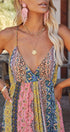 - Tasarım: V yakalı seksi sırtı açık spagetti askılı blok renkli baskılı yüksek belli kloş yazlık elbise