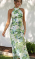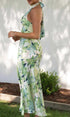 Gill Baskılı Halter Yaka Sırtı Açık Saten Midi Elbise