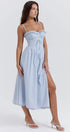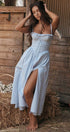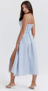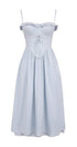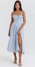 Bu mavi Broderie Anglaise midi elbise, göz kamaştıran kalp şeklinde bir yakaya ve kişiselleştirilmiş bir uyum için ayarlanabilir askılara sahiptir. Yüksek bölünmüş kısım cazibeli bir dokunuş katarken, pamuklu ve işlemeli dantel kumaş konfor ve şıklık sağlar.