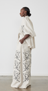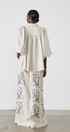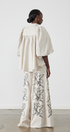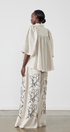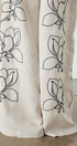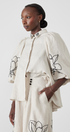 Oversize gömlek kesimi, balon formda kollar ve geniş paça pantolonla birleşerek dengeli bir silüet sunar. Kol, yaka ve pantolon paçalarındaki büyük floral siyah nakışlar ise tasarıma karakteristik bir görünüm kazandırır.