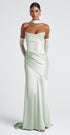 Işığın her kıvrımda dans ettiği Kensington Maxi Dress, pastel zarafeti ve akışkan formuyla göz kamaştırıyor. Drapeli straplez üst bölgesi, bele oturan korsaj yapısı ve kuyruklu saten eteğiyle her davete bir kırmızı halı hissi katıyor. Mint tonundaki eşsiz duruşuyla romantik ve sofistike bir görünüm arayanlar için tasarlandı. Aynı tonda fular ve tül eldiven ile tamamlandığında unutulmaz bir etki bırakır.