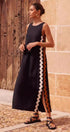 Yan kısımlarda kontrast beyaz ve mor ric rac detaylarıyla süslenmiş canlı kırmızı bir tabana sahip, çarpıcı kolsuz maksi elbisemizle kendinizi ifade edin. Yüksek yuvarlak yaka ve anahtar delikli tek düğmeli arka kısım, bu zahmetsiz şık parçaya sofistike bir dokunuş katıyor.