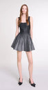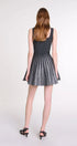 Kare yakalı ve iki cepli bu kısa, streç elbiseyle cesur bir duruş sergileyin. Payetli çizgilerle vurgulanan yapılandırılmış kesimi, karşı konulamaz bir hacim oyunu için geniş bir eteğe kadar uzanıyor.