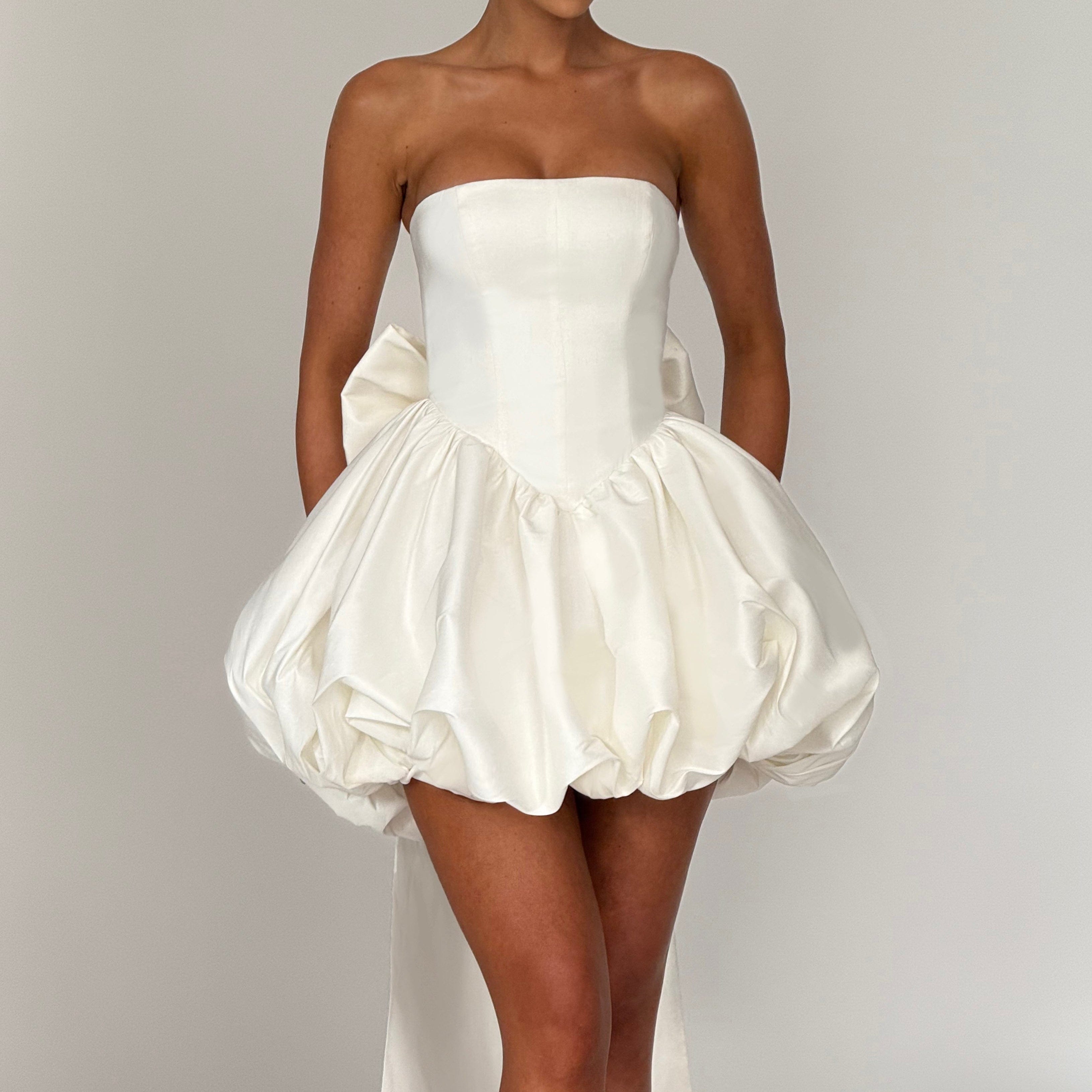 Işıltılı gecelerin yıldızı olmaya hazır mısın? Lotus Elbise, masalsı silueti ve göz alıcı balon eteğiyle zarafeti yeniden tanımlıyor. Arka kısmındaki büyük fiyonk detayı ise bu tasarımı unutulmaz kılıyor. Mezuniyetler, after party’ler veya nikah sonrası kutlamalar için ideal bir parça.