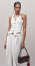- Tasarım: V yakalı, sırtı açık, işlemeli gül düğmeler, çıkarılabilir bel bandı, ipek güller