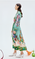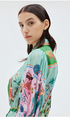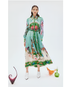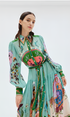 Tam boy düğmeli formu, balon kolları ve kuşak detayıyla klasik gömlek elbise formunu yeniden yorumluyor. Üzerindeki illüstratif desenler, doğadan ve sembollerden ilhamla tasarlanmıştır. Etek ucunda geniş desen geçişleriyle elbise, adeta yürürken tablo etkisi yaratır.