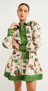 Bu sanatsal elbise, benzersiz bir grafiti baskısı ve tek sıra düğmeli tasarımıyla modern tarzı eğlenceli ayrıntılarla harmanlıyor. Uzun fener kolları hacim ve zarafet katarken, bel kravatı göz kamaştırıcı, sıkı bir siluet yaratıyor.