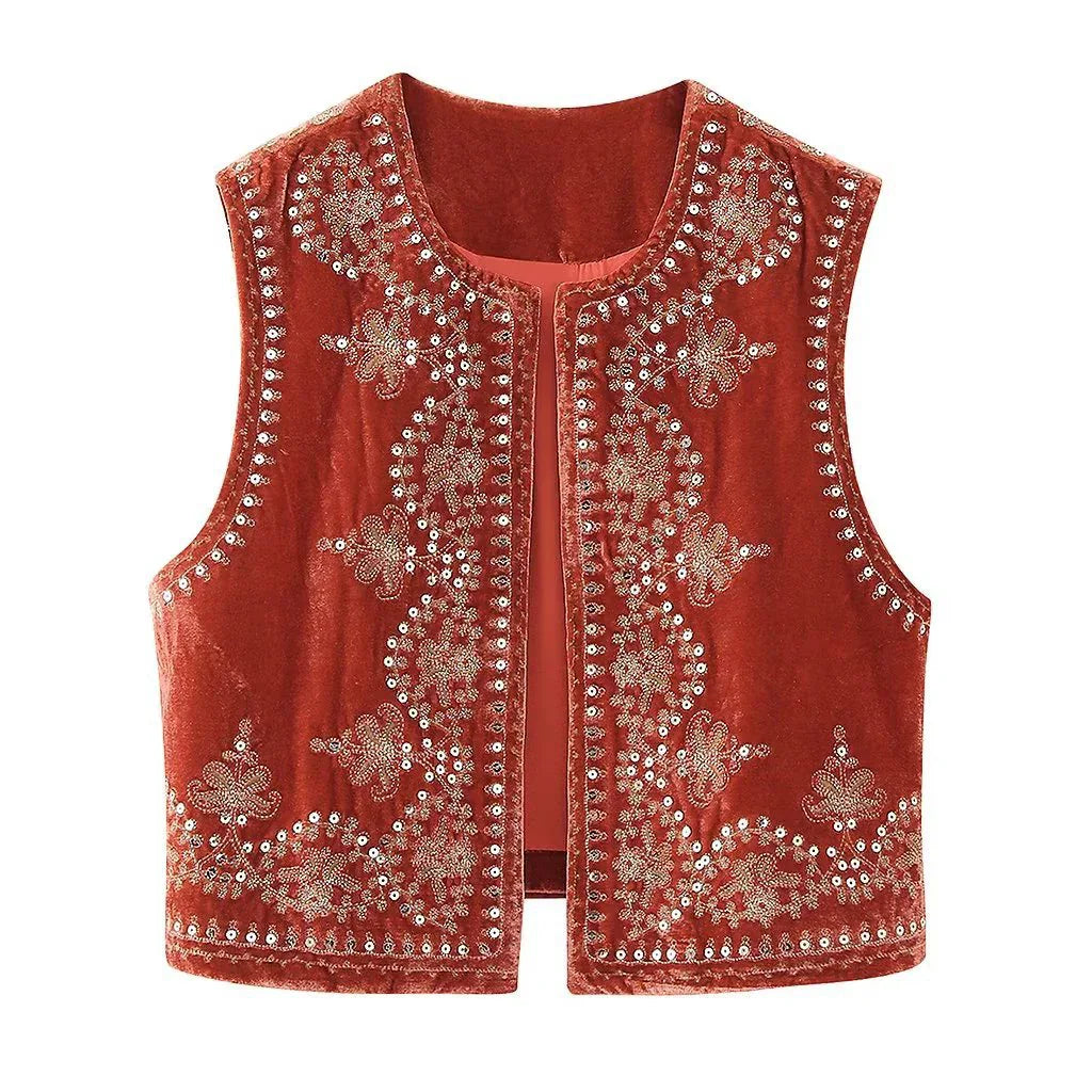 Lüks polyesterden üretilen, pırlantalarla süslenmiş, önü açık yeleğimizle tanışın. Bu hırka, şık tasarımını öne çıkaran göz kamaştırıcı yapay elmas vurgularıyla zarafeti ve konforu birleştiriyor.