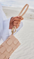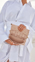 Moa modeli, ikonik deri eşya örgü tekniğini dalga benzeri dalgalı hatlarla yumuşatarak ve birbirine geçen düz ve taneli ton-sür-ton derilerle yeniden yorumlar. Akıllı katlamalar mini çantaya şekil ve hacim verir.