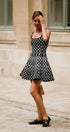 Grafik Motifli Mini Elbise ile tarzınızla öne çıkın. Cesur beyaz grafik tasarıma sahip bu elbise, modern bir dokunuş için göz alıcı kare yaka ve geniş askıları sergiliyor. Genişletilmiş etek ve iki cep hem işlevsellik hem de zarafet katıyor.