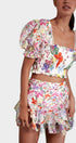 Bu çarpıcı parça, geometrik güpürlerle süslenmiş asimetrik fırfırlara ve elle boyanmış baskı elemanlarına sahip olup benzersiz ve göz alıcı bir tasarım yaratıyor. Kare yaka ve kısa kabarık kollar vintage bir çekicilik katıyor, büzgülü panel ve büzgülü detaylar ise yüksek esnekliğe sahip hoş bir uyum sağlıyor.