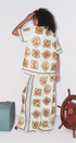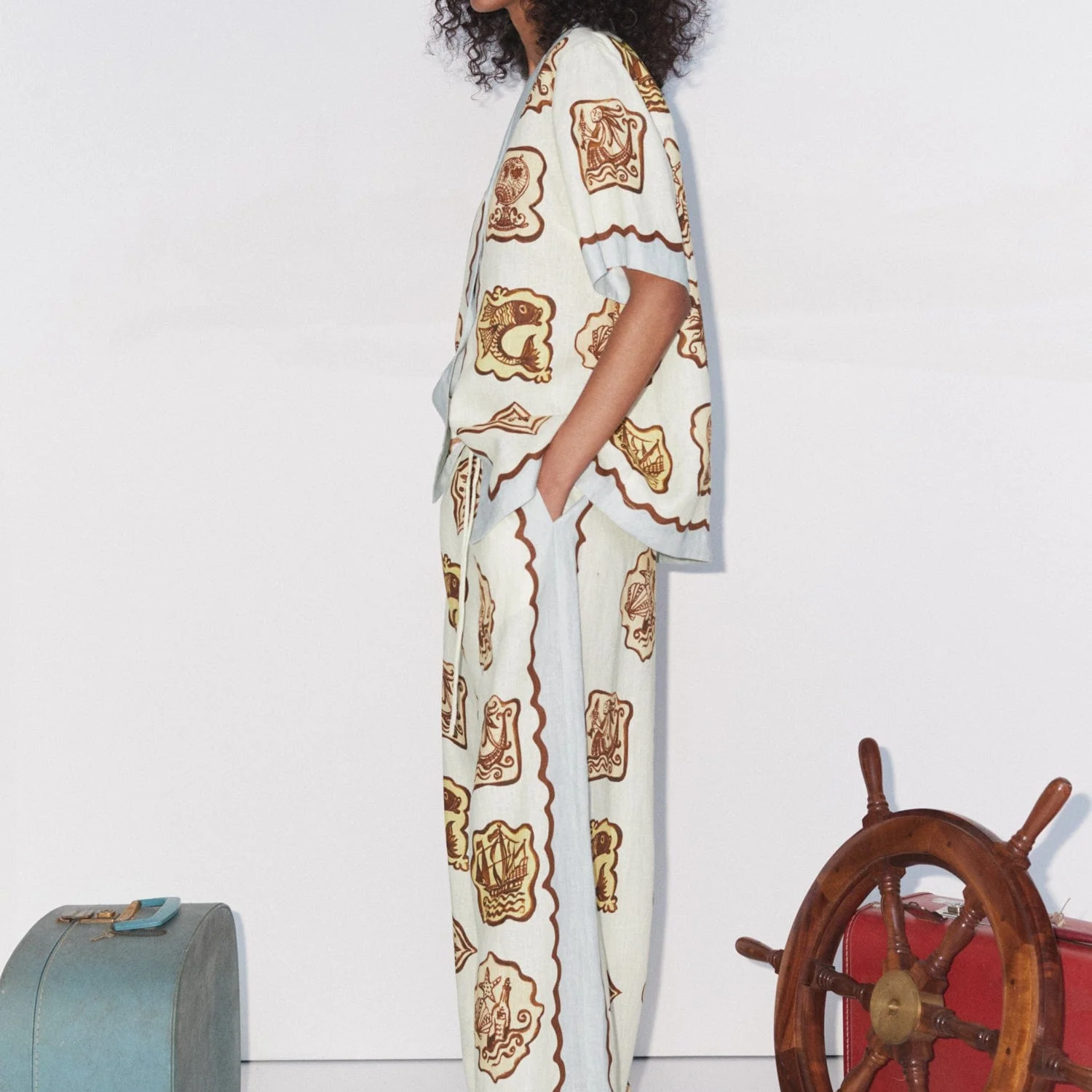 Retro deniz temalı desenleriyle tasarlanan Mosaic Cruise Palazzo Pantolon, yaz mevsiminin ruhunu her adımda taşıyor. Geniş paçalı, akışkan kalıbı ve doğal kumaşı sayesinde gün boyu hem konforlu hem dikkat çekici bir görünüm sunar.