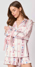 Bu karikatür baskılı pijama takımı, sevimli şeritli manşetleri ve kollarında ve pantolon paçalarında narin marul süslemesiyle eğlenceli bir çekicilik yayıyor. Yumuşak, nefes alabilen kumaştan üretilen bu ürün, evde geçirdiğiniz süre boyunca rahat bir rahatlık sağlar ve ev kıyafetlerinize tatlı, ilginç bir dokunuş katar.