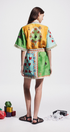 Patchwork bloklardan oluşan renkli tasarımı; iskambil kağıdı desenleri, zar ve tavla motifleriyle tamamlanır. Yarım kollu, rahat kesim gövdesi ve kendi kumaşından kuşağı ile bel vurgusu yapılabilir. Düğmesiz, pratik giy-çık formundadır.