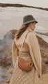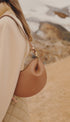 Ahşap bir kalıp üzerinde deriyi şekillendirilerek elde edilen “Rivah” çantasının yuvarlaklığı, bükülmüş metal tokaya karışan katları tarafından şekillendirilir. Çantanın kontrast oluşturan gövdesi ve omuz askısı, düz ve dokulu derilerden oluşur.