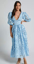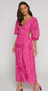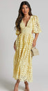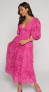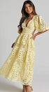 Bu midi elbise V yakalı, 3/4 kollu ve zarif A kesimli bir siluete sahiptir. Kesik ayrıntılar ve karmaşık dantel işlemeler, sofistike ve çekici bir dokunuş katıyor.