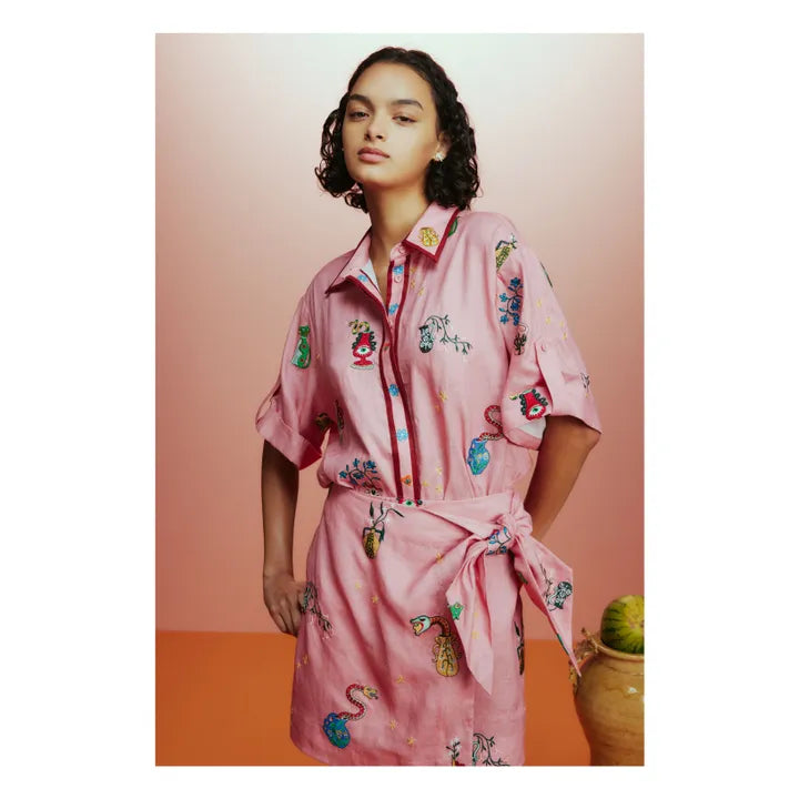 Biraz masal, biraz mit… Serpentina Mini Etek, mistik illüstrasyonları ve dikkat çeken nakış detaylarıyla sezona karakter katıyor. Yılan figürleri, antik sürahi motifleri ve altın yıldız nakışlarıyla hem eğlenceli hem sanatsal bir dil kuruyor. Kuşak detayı bele hareket katarken, kısa formu modern bir enerji yayıyor.