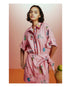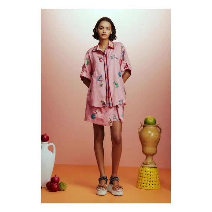 Yılanlı sürahiler, stilize bitkiler ve yıldız detaylarıyla bezenmiş Serpentina Gömlek, oversize kalıbı ve pembe zemin üzerindeki illüstrasyonlarla cesur ama romantik bir stil sunar. Hem tek başına elbise gibi kullanılabilir, hem de etek veya şortlarla kombinlenebilir.