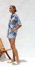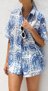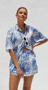 Beyaz zemin üzerine mavi baskıya sahip bu şık iki parçalı setle gardırobunuzu güncelleyin. Set, şık ve gündelik bir görünüm sunan, kutu gibi bir silüet ve hafif yuvarlak alt kenarlı, rahat kesimli, yakalı, düğmeli bir gömlek içerir. Üst kısım astarsız ve şeffaftır, katmanlama için mükemmeldir.
