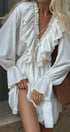Fırfırlı Derin V Yaka Mini Elbise ile vintage çekiciliğin dokunuşunu kucaklayın. Kabarık omuzlu uzun kollu, derin V yakalı ve eğlenceli Peter Pan yakalı bu elbise, klasik ve çağdaş tarzın mükemmel bir karışımıdır. A kesimli siluet ve mini uzunluk, göz kamaştırıcı ve kadınsı bir görünüm yaratıyor.