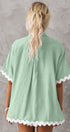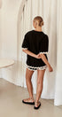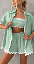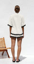 Düz gömlek bluz ve kontrast yama işi ile yüksek bel geniş bacak şortundan oluşan düz monoton setimiz kesinlikle dikkat çekicidir. Yaz setleri tüm yıl boyunca en çok satan saatlerdir. Günlük bir etkinlik olan bu geceki buluşmada baskılı desenli yaka ve kollar, genel görünümün estetiğine sadece bir dokunuş katıyor.