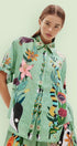 Yaka detayından paçaya kadar uzanan işlemeli desenler; tropik bitkiler, hayvan figürleri ve sembollerle harmanlanarak sanatsal bir ifade sunar. Gömlek bol kesim ve kısa kolludur. Şort ise yüksek bel, rahat kalıptır ve ceplidir. İster birlikte, ister ayrı ayrı kombinlenebilir.