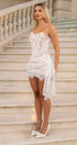 Düşük omuz stili ve düzensiz dantel vurgularıyla korse tasarımına sahip bu askısız mini elbiseyle kendinizi gösterin. Dantel ve fileden üretilen bu ürün, sofistike, esnemeyen bir kesimle vücuda oturan bir silüet sunuyor.