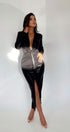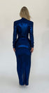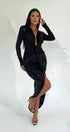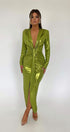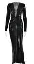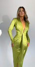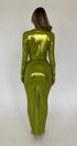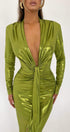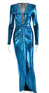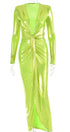 Bu son derece parlak metalik elbise, çarpıcı derin V yakalı, yüksek yırtmaçlı ve şık düğümlü bel hattına sahiptir. Metalik jarseden üretilen bu ürün, daha fazla konfor için yüksek esnekliğe sahip, vücuda oturan bir siluet sunuyor. Akşam etkinlikleri, kokteyl partileri veya özel günler için mükemmel olan bu elbise, göz alıcı bir görünüm için yüksek topuklu ayakkabılar ve cesur aksesuarlarla eşleştirilebilir.