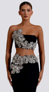 - Tasarım: Bedene oturan bodycon etekle eşleştirilmiş, yapay elmas çiçek süslemeli askısız kısa üst