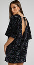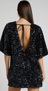 - Tasarım: Kadife, pullu detaylı, arkası V yakalı ve sırtı açık kısa kollu elbise