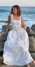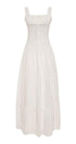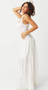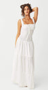 Klasik bir görünüm için kare yakalı ve geniş askılı bu büyüleyici maksi elbiseyle tarzınızı yükseltin. Katmanlı etek eğlenceli bir zarafet katıyor, ön bağ ve düğme detayı ise benzersiz tasarımını güçlendiriyor.