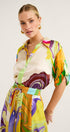 Soyut manzara baskısı ve rahat kesime sahip bu sofistike setle gardırobunuzu yükseltin. Kısa kollu bluz, kıvrımlı kol paçalarını ve ön kısmı düğmeli olarak öne çıkarken, bol A kesim etek zarif bir dokunuş katıyor. Orta derecede esnek satenden üretilen bu takım, konfor ve stili zahmetsizce birleştirir.
