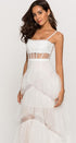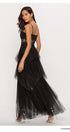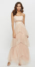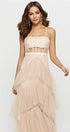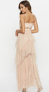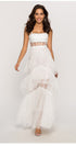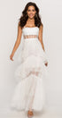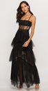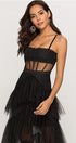 Bu çarpıcı yere kadar uzanan korse elbise, verev kesim fırfırlı katmanlara ve transparan bele sahiptir ve modern zarafeti şehvetli bir dokunuşla birleştirir. Orta derecede esnek örgü kumaştan üretilen bu ürün, güzel bir uyum sunar ve daha fazla konfor için tamamen astarlıdır. Ayarlanabilir askılar kişiye özel uyum sağlarken arka orta kısımdaki görünmez fermuar kusursuz bir görünüm sağlar.