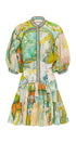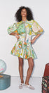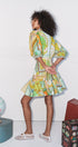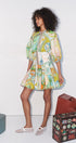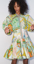 Renklerin ve desenlerin cesur dansı… Bu özel tasarım elbise, vintage harita detaylarıyla süslenmiş, canlı ve sofistike bir görünüm sunar. Volanlı eteği ve hafif balon kollarıyla hareketli bir silüet yaratırken, bel kısmındaki oturumu sayesinde vücut hatlarını zarifçe vurgular.