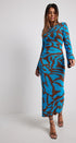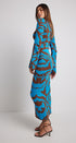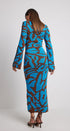 Bu bilek boyu elbise, soyut bir jakar desenine ve şık bir yuvarlak yakaya sahiptir. Bedene tam oturan tasarım, yüksek esnekliğe sahip trikolar ve zarif geniş kollarla tamamlanıyor.