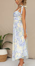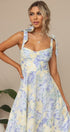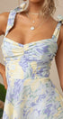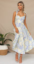 Bu elbise, kalp yakalı ve kıvrımlı göğüs tasarımlı, büyüleyici soyut çiçek baskısına sahiptir. Papyon askıları ve şekillendirilmiş korsaj, kadınsı çekiciliğini artırırken geniş etek kısmı eğlenceli bir dokunuş katıyor.