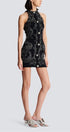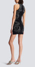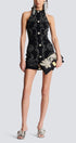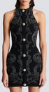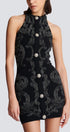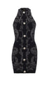 Bu mini elbise, yuvarlak yakalı ve işlemeli suni düğmelere sahiptir ve şal desenli kakma desenine sofistike bir dokunuş katmaktadır. Yüksek esnekliğe sahip trikodan üretilen bu ürün, hoş bir uyum ve rahat bir kullanım sunar.